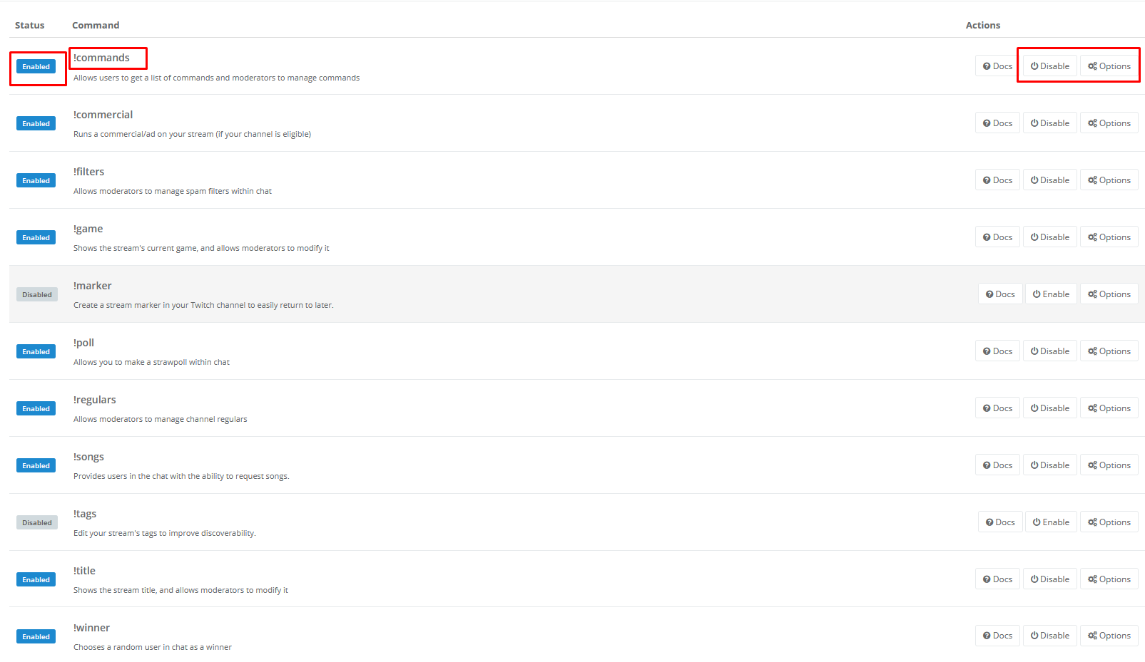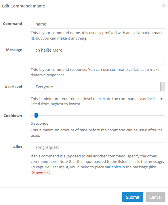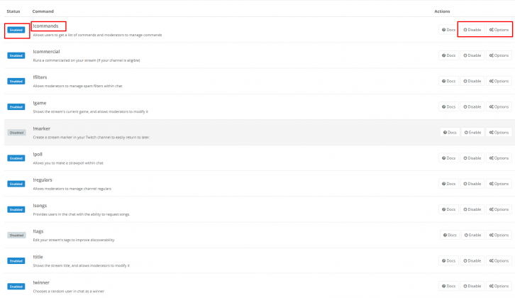 Bei den bereits bestehenden Commands kannst du diese aktivieren oder deaktivieren, sowie den Cooldown und die benötigte Berechtigung einstellen.